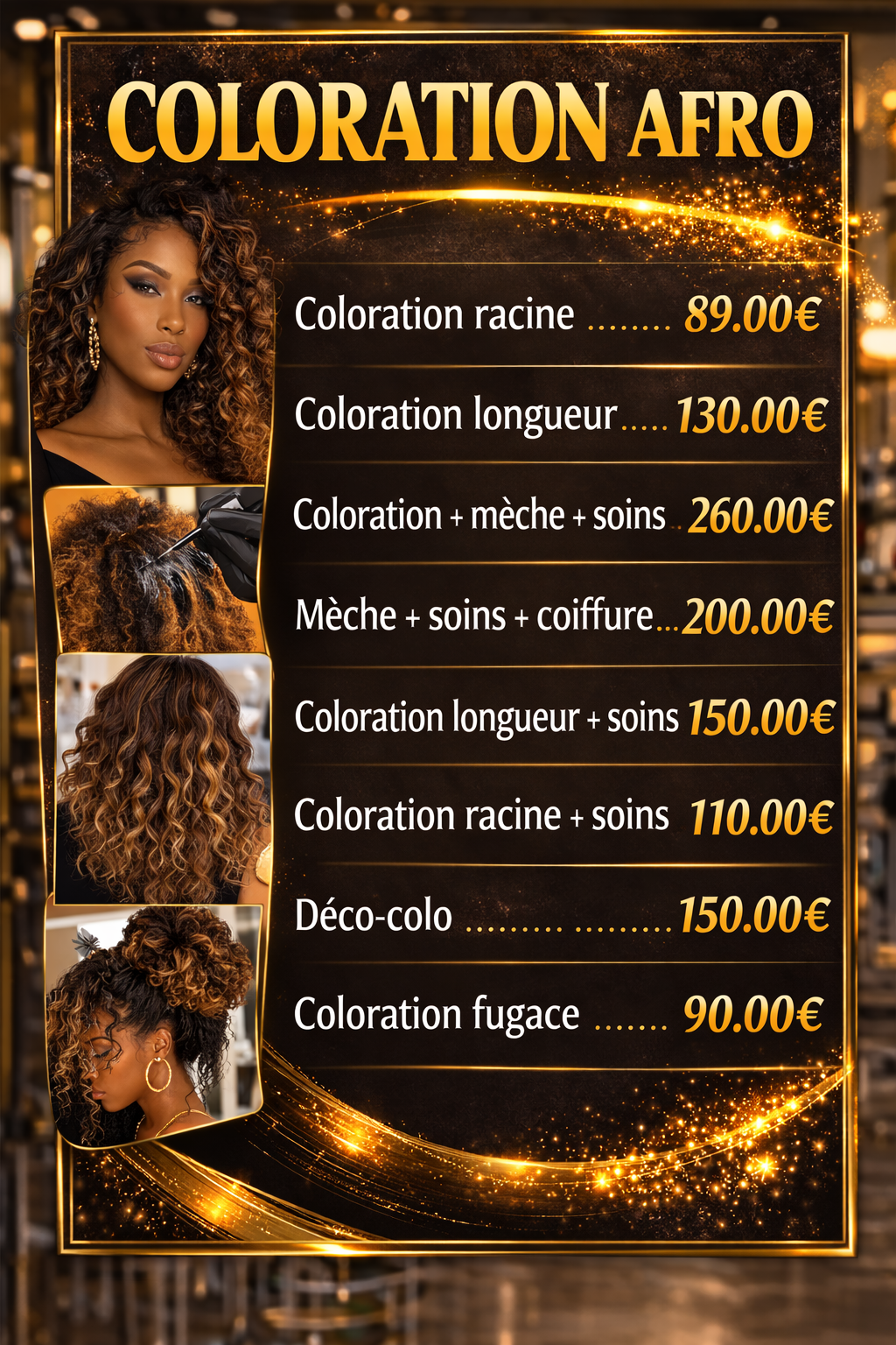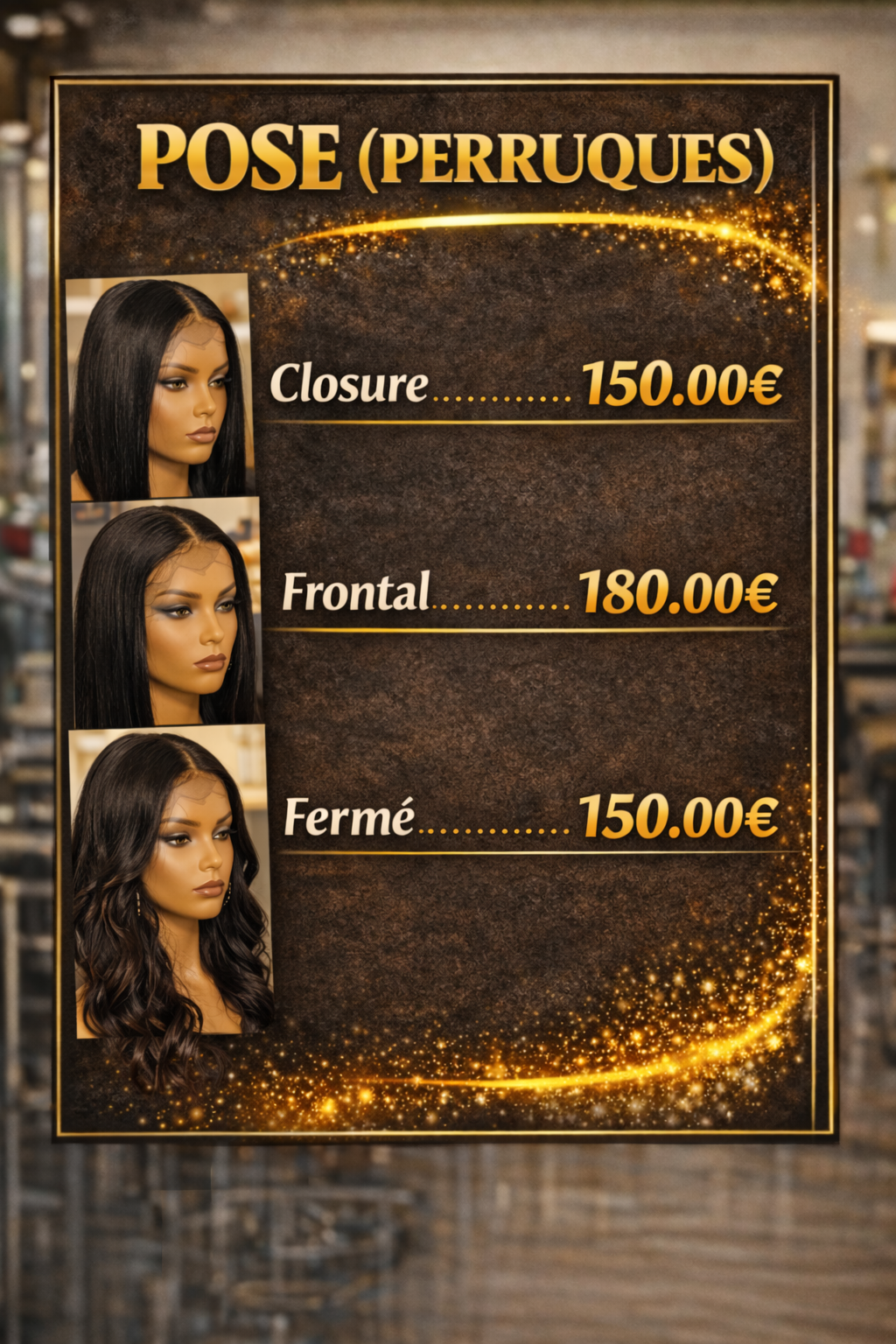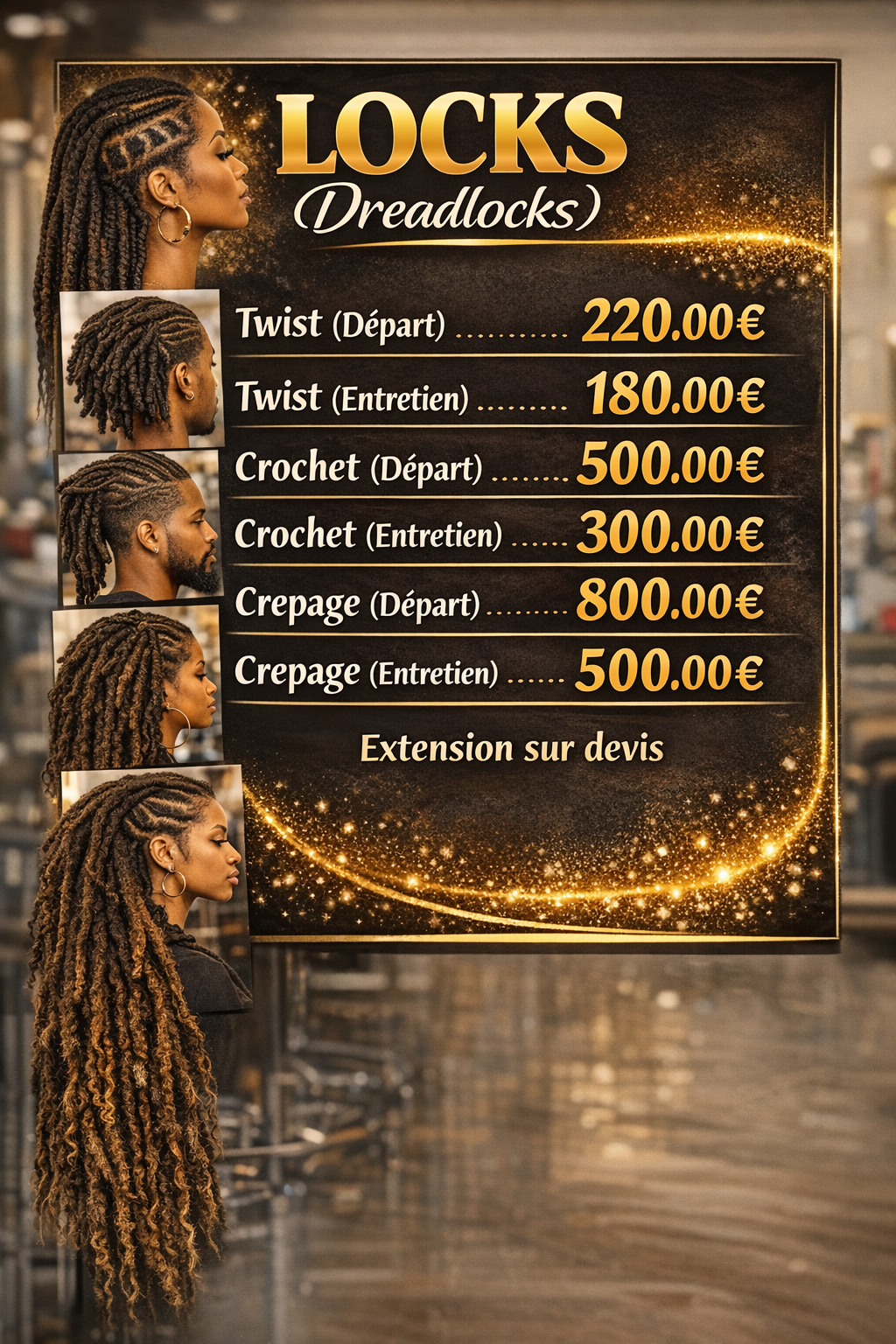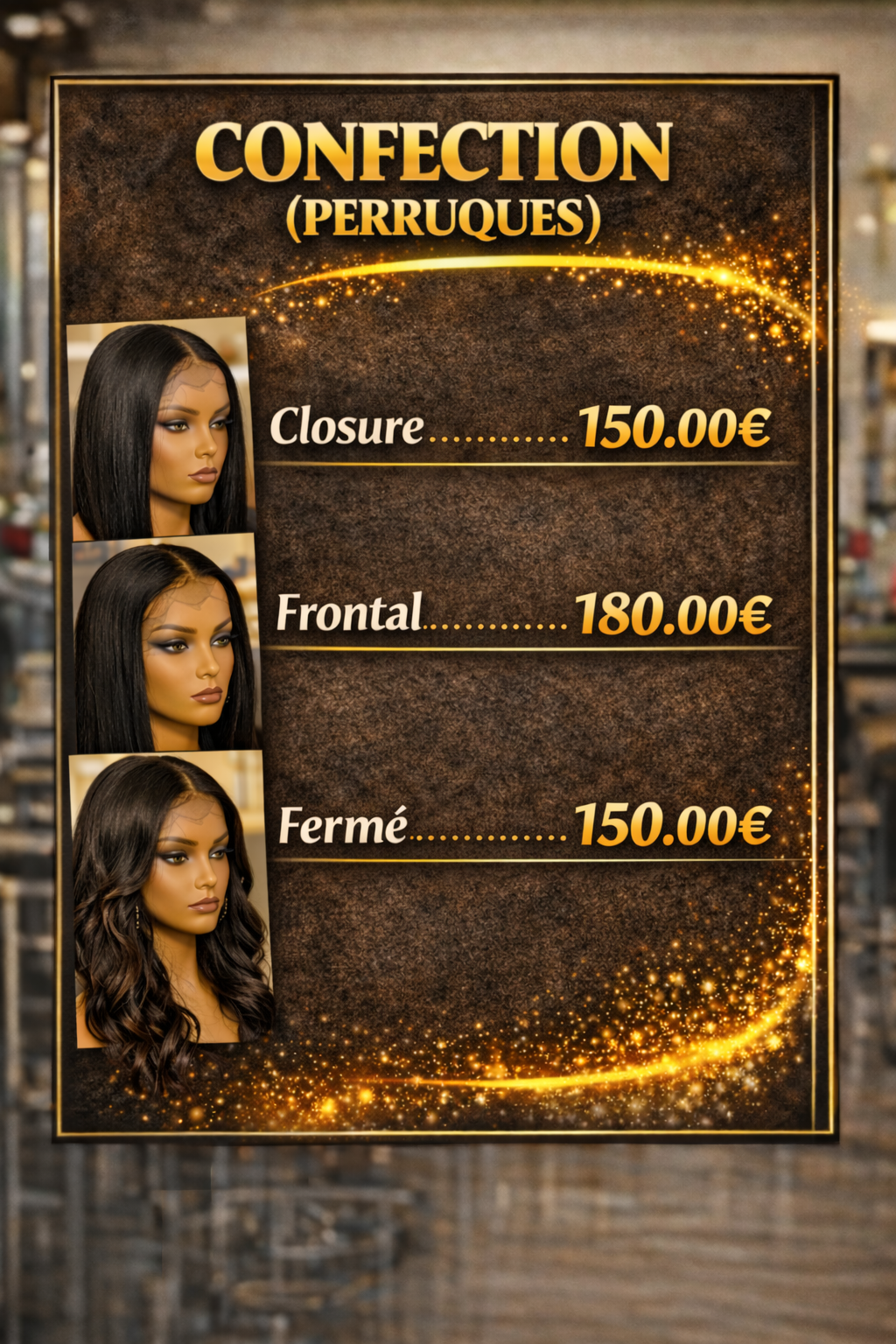 Nous proposons une large gamme de services : coiffure, techniques capillaires, extensions et confection de perruques sur mesure. Nos tarifs sont établis en fonction de la qualité des produits utilisés, du savoir-faire de notre équipe et du temps nécessaire pour chaque prestation.