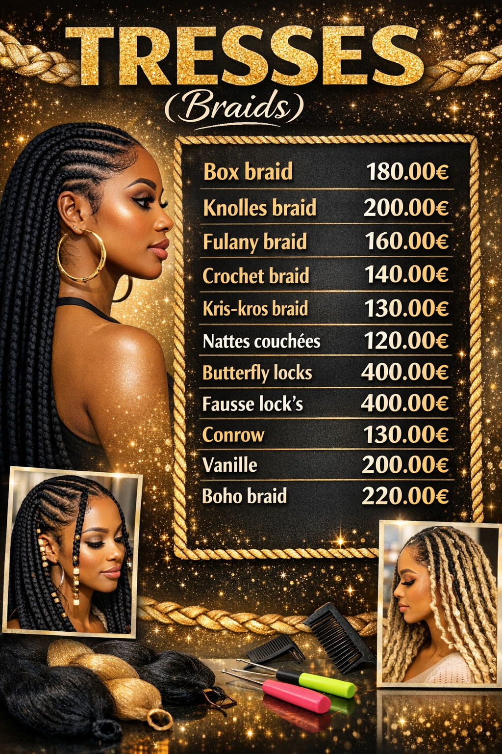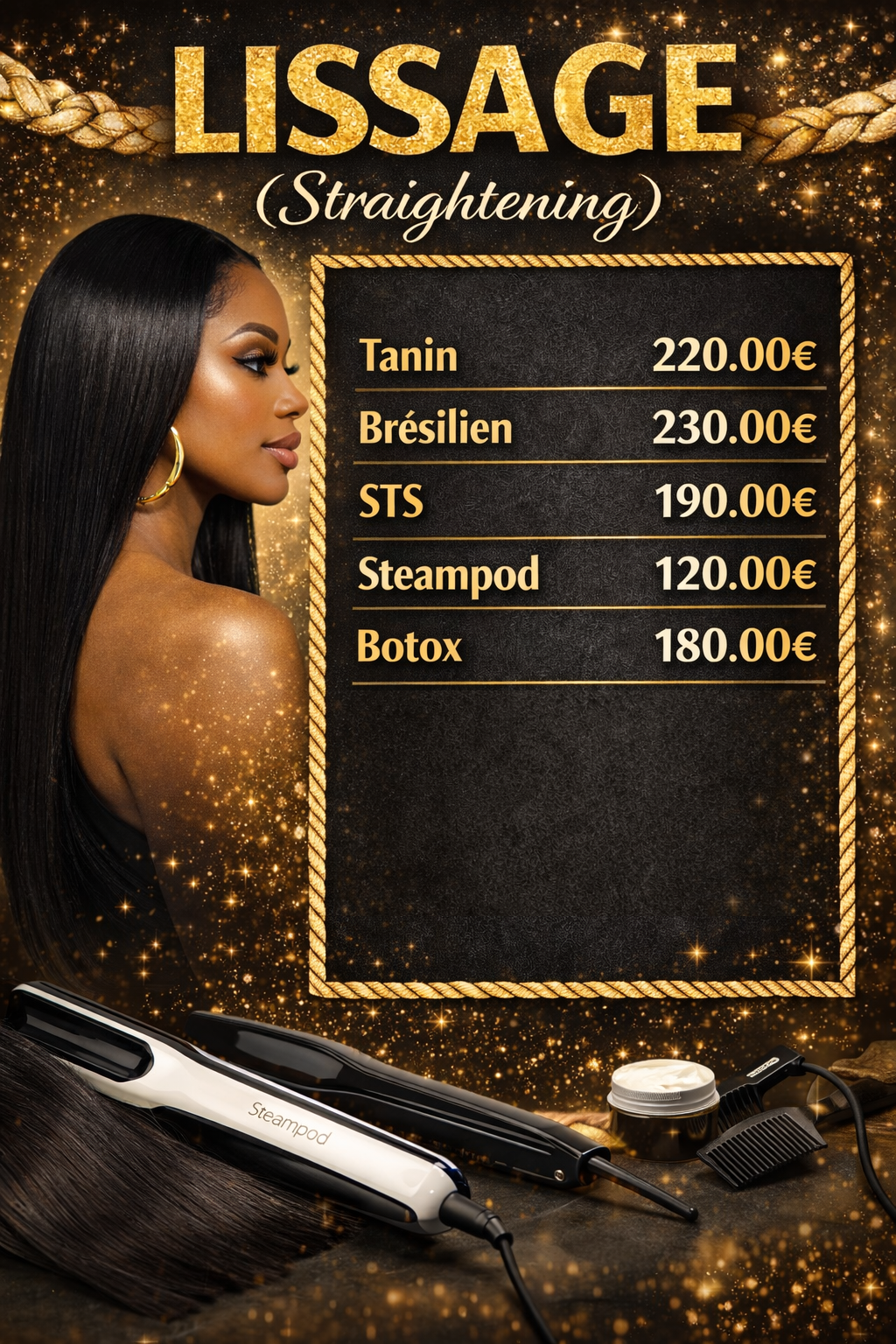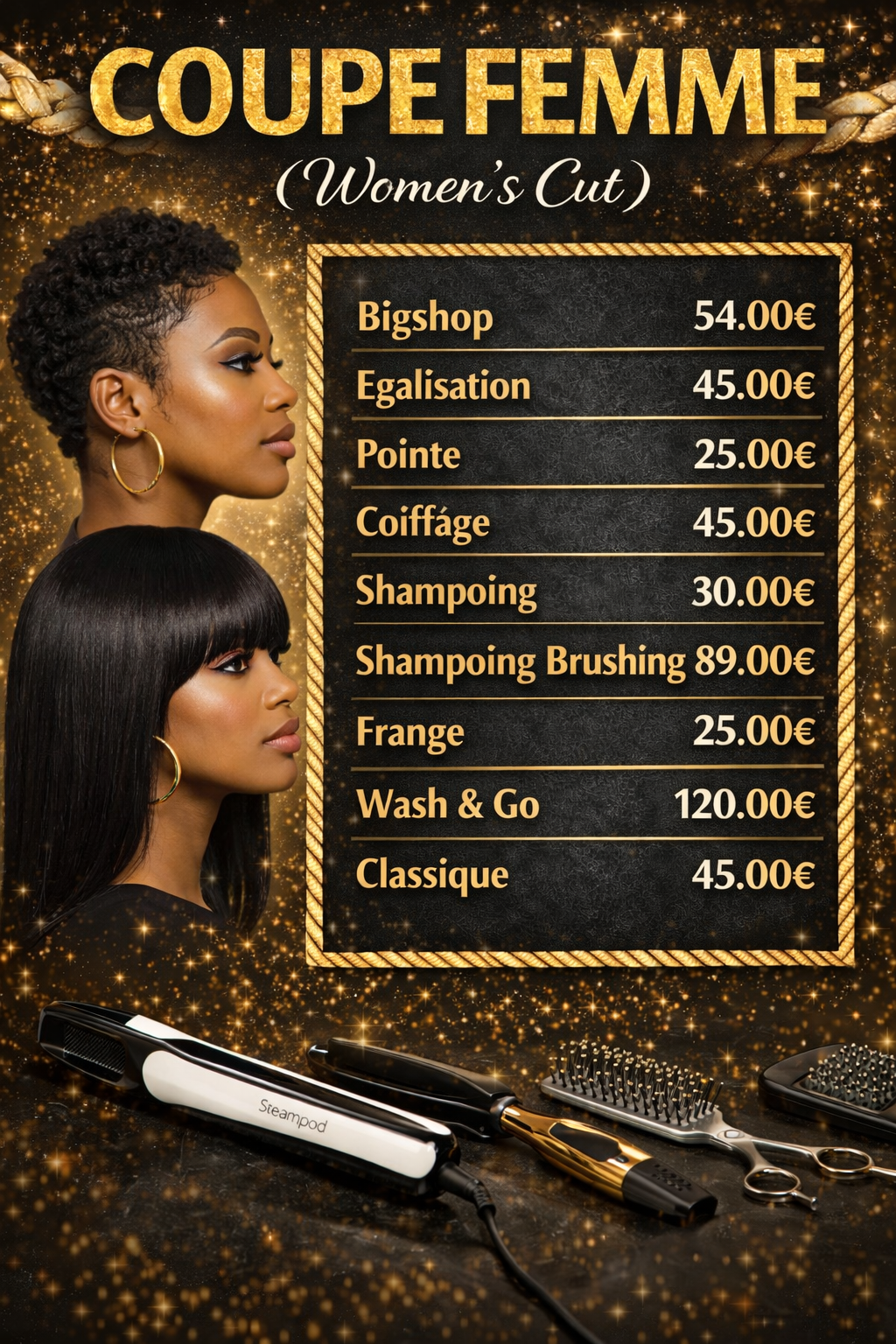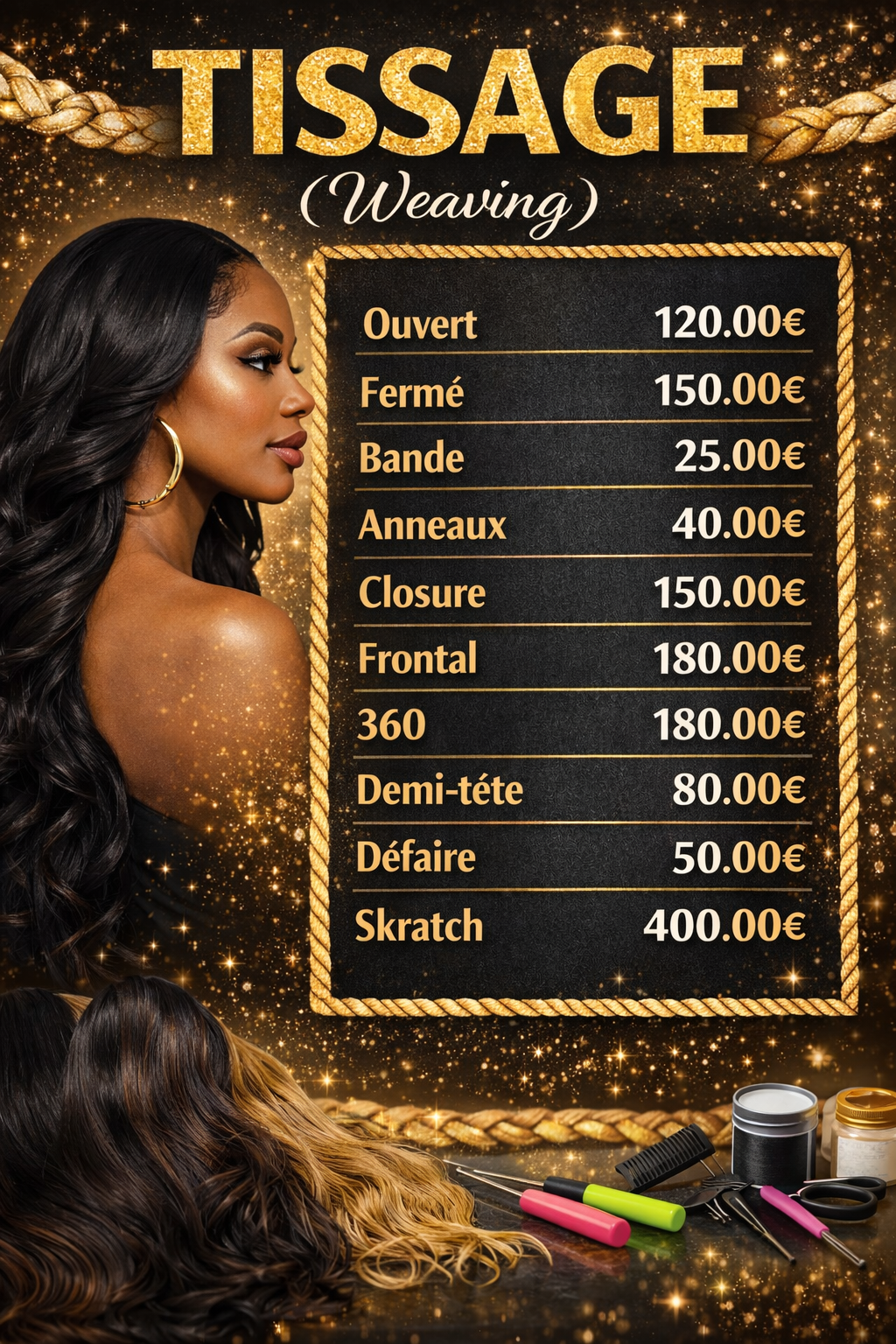 Nous proposons une large gamme de services : coiffure, techniques capillaires, extensions et confection de perruques sur mesure. Nos tarifs sont établis en fonction de la qualité des produits utilisés, du savoir-faire de notre équipe et du temps nécessaire pour chaque prestation.